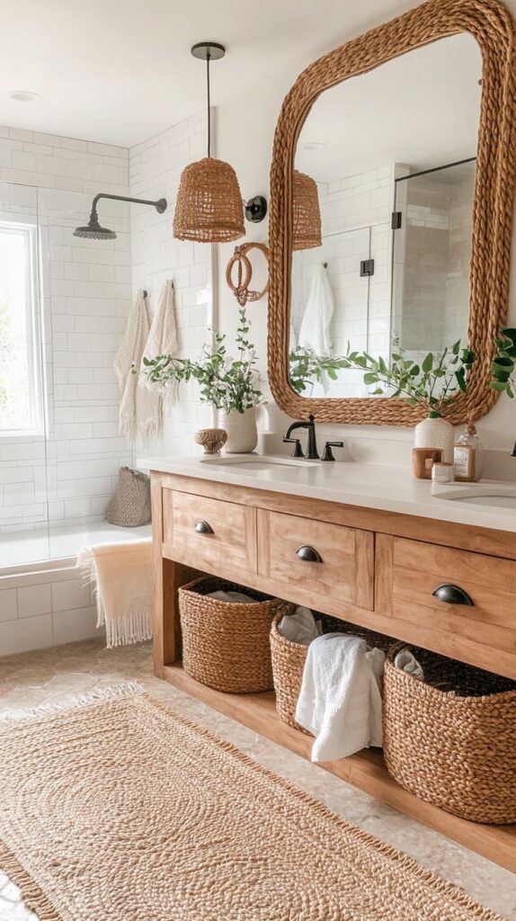 In guest powder rooms, small rattan plaques or starburst motifs grouped on a wall can create a quirky focal point. Rattan wall sconces or pendant lights in a bath will also echo that cozy feeling (just ensure they are rated for damp areas). The overall effect is that even a utilitarian space feels more homey and storied.